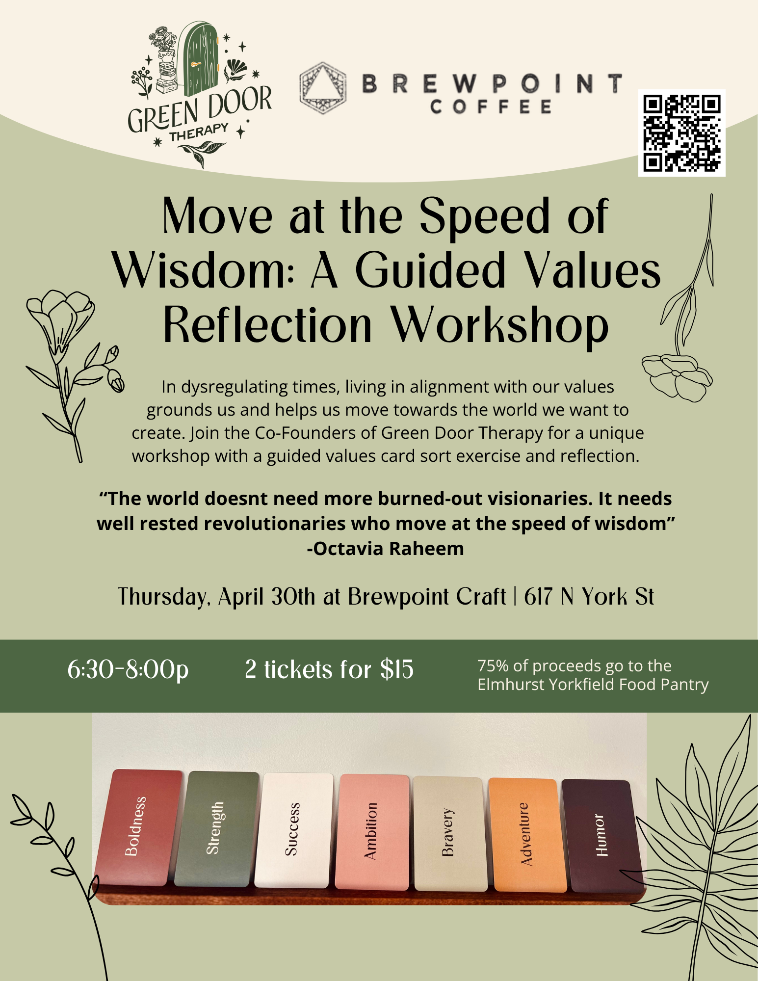 Join us for a values clarification workshop on April 30th from 6:30–8:00 PM at Brewpoint Craft in Elmhurst! Last Spring at Brewpoint Coffee, our community explored What It Takes to Heal by Prentis Hemphill, reflecting on the powerful reminder: “The world doesn't need more burnt out visionaries, it needs well-rested revolutionaries who move at the speed of wisdom.” – Octavia Raheem